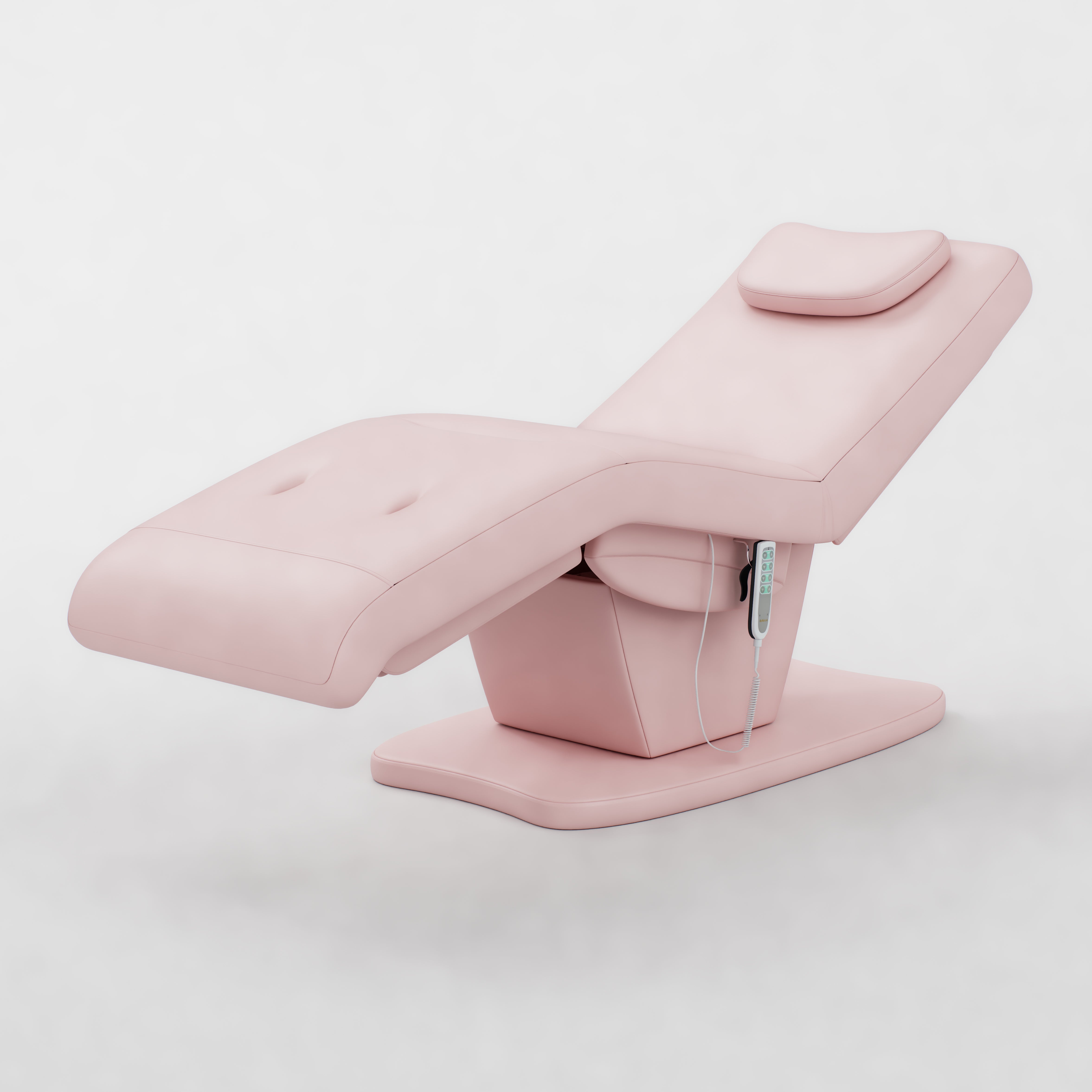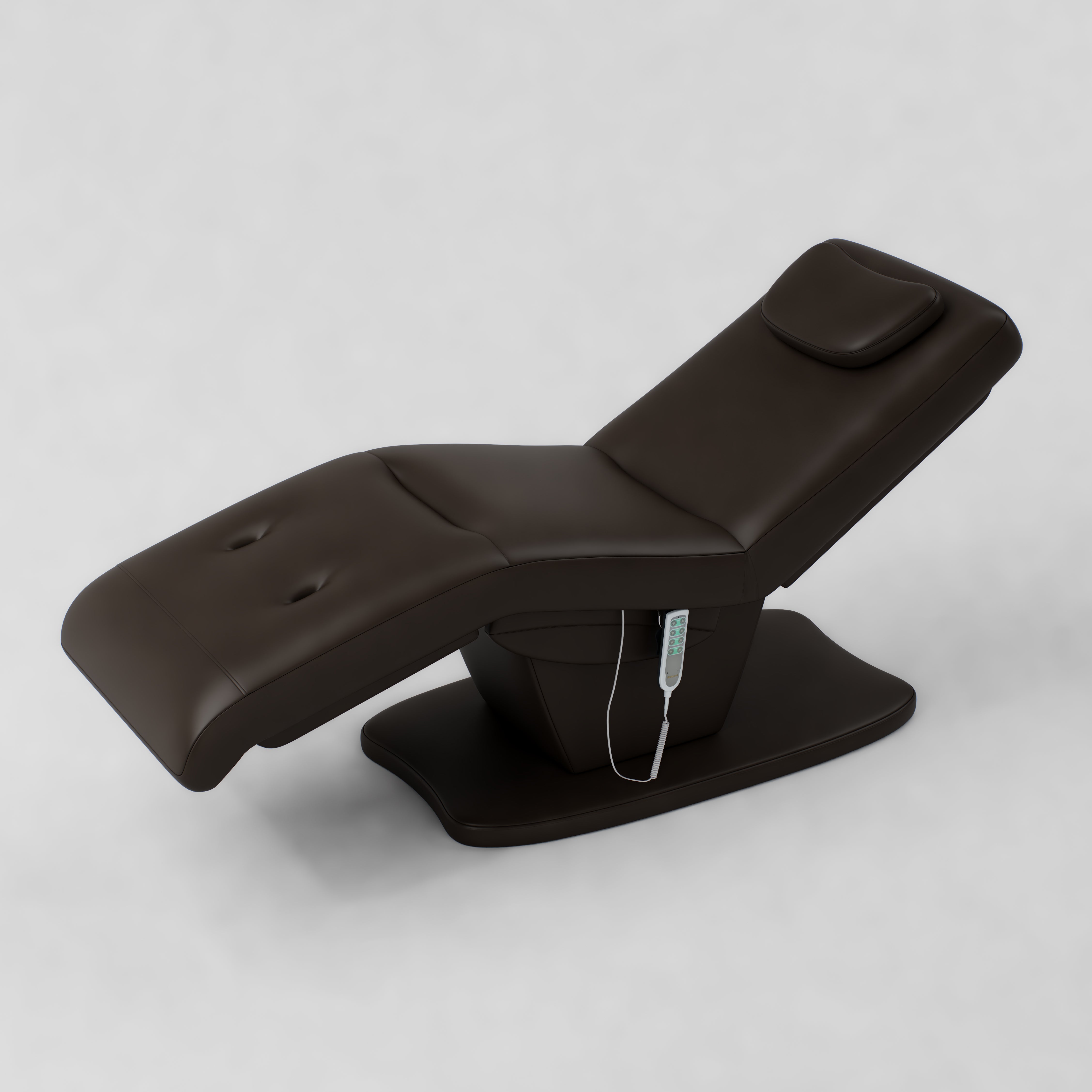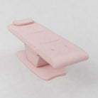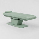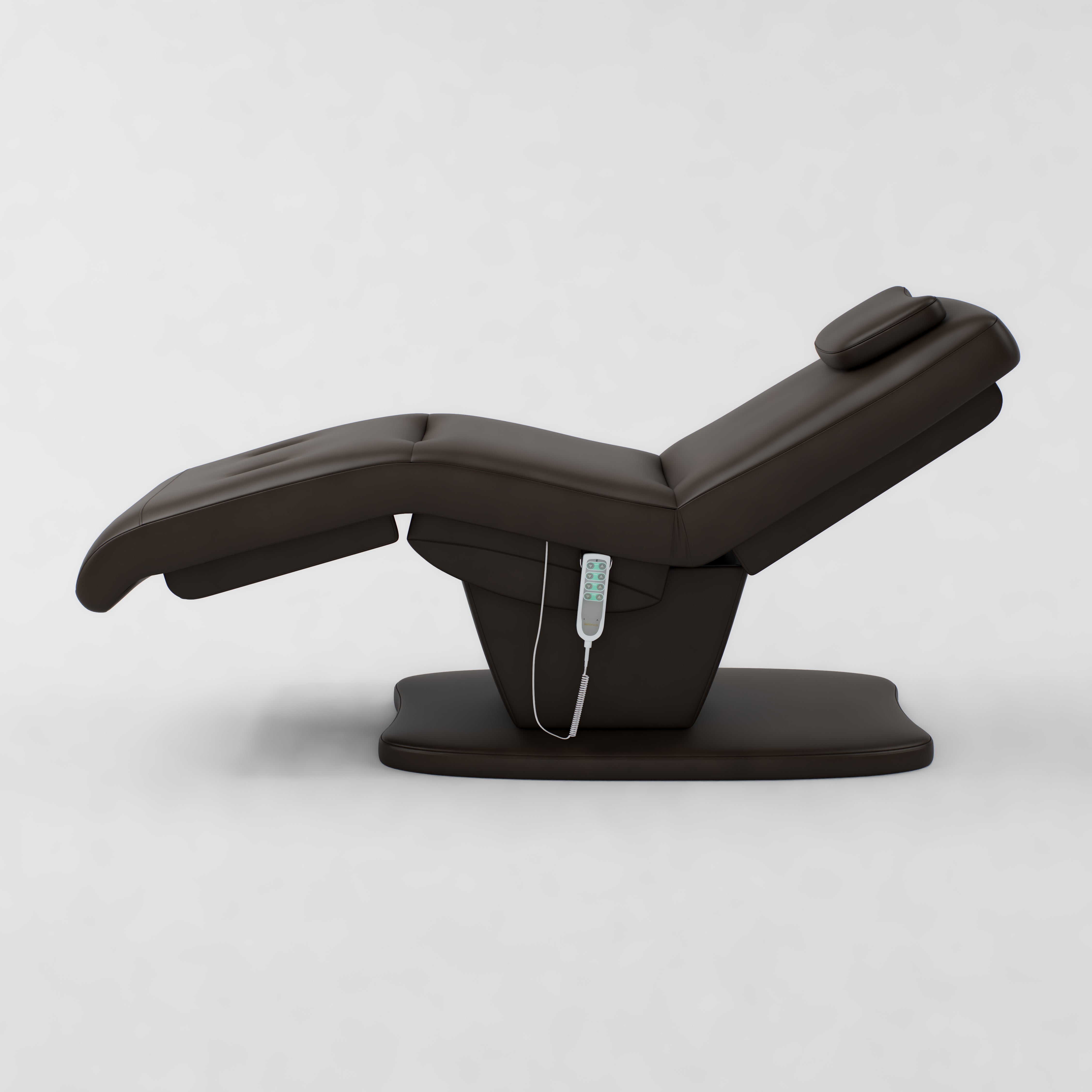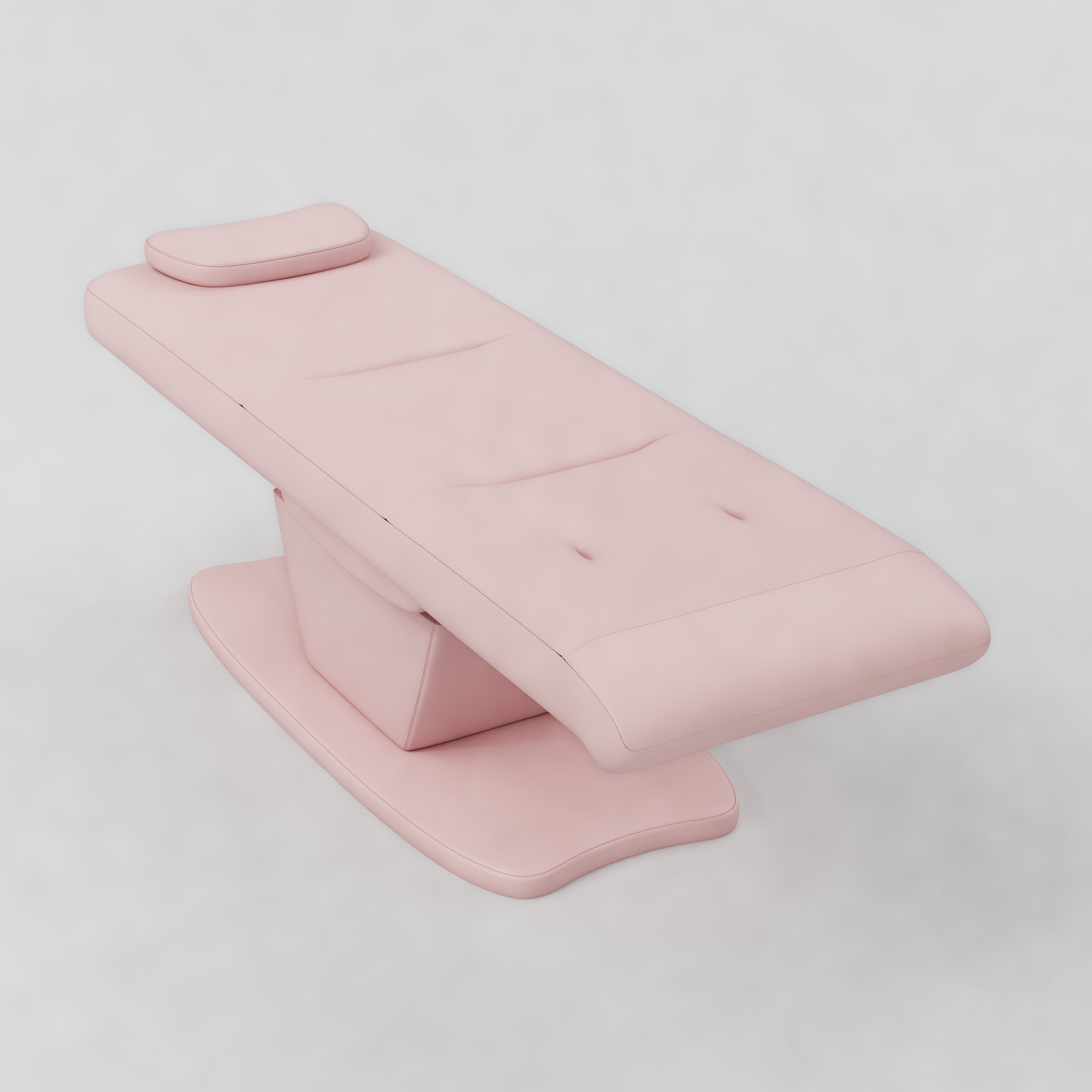 The Paloma is an electric beauty bed designed for comfort and easy adjustment. It features vegan stain-resistant leather and an ergonomic shape for client support. The bed includes a standard power plug, four motors, and an electric remote control for smooth adjustment. Height, backrest, footrest and bed tilt can all be adjusted electrically, and it comes with a head pillow included which can be removed to reveal the face hole.